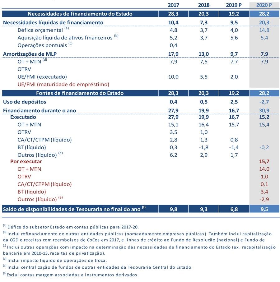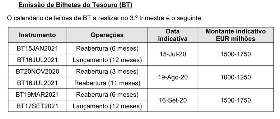 Tal como já tinha sido anunciado no Orçamento Suplementar, o financiamento líquido através da emissão de Bilhetes de Tesouro (BT) registará um incremento de 3,2 mil milhões de euros, que compara com uma variação liquida projetada inicialmente de 1,3 mil milhões de euros.